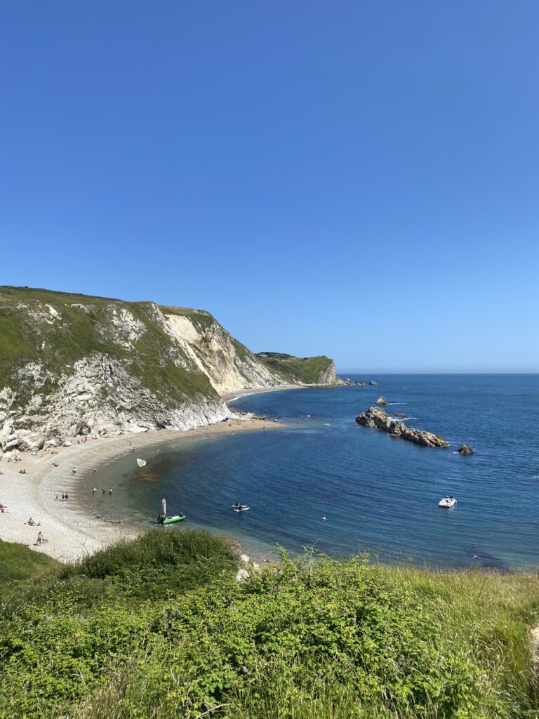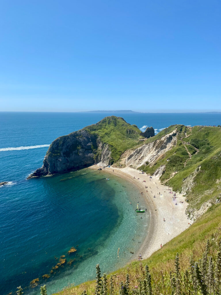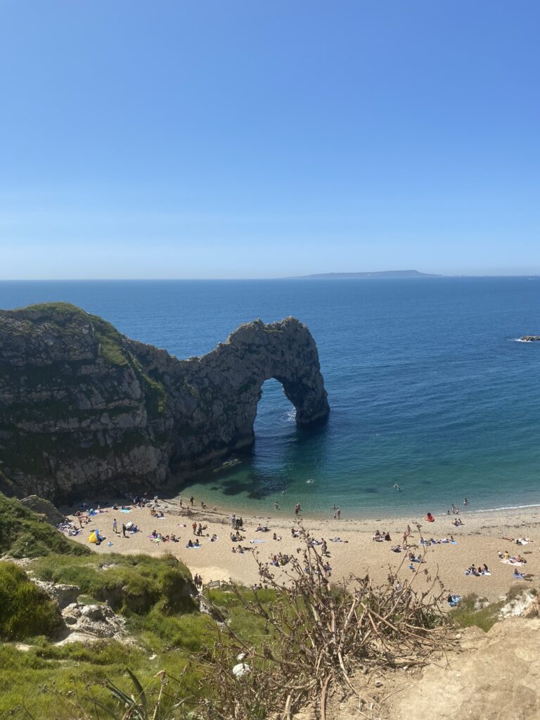 První den jsme tedy autem vyrazili z hrabství West Sussex na jižním pobřeží. Naším cílem byl 180 mil (přes 4 hodiny cesty) vzdálený Plymouth, na samé hranici mezi Devonem a Cornwallem. Naplánovala jsem, že po cestě zastavíme na pobřeží v Dorsetu u slavného vápencového oblouku Durdle Door. K dispozici je tam placené parkoviště a na místě je možnost občerstvení ve stáních (minimálně v letní sezóně). Jedná se o nádhernou pláž, tedy zde bohužel počítejte s davy lidí. Od parkoviště je to cca 10 minut pěšky po docela strmém kopci, kde určitě neprohloupíte s vhodnou obuví. Toto doporučení jsem se dočetla i na parkovišti, přesto jsem si však už nechtěla měnit pantofle a odměnou jsem si je zničila při cestě zpět. Pláž Durdle Door nicméně stála za to, voda byla nádherná, průzračná a skvěle osvěžila. Vedle byla pláž Man O’War, také krásná, jen se k ní muselo opět vyšplhat a potom po schodech dolů.