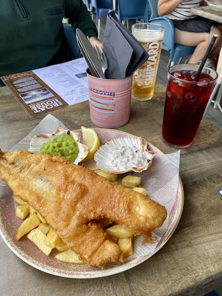 Ráno po snídani jsme vyrazili do města. Byla nám doporučena část the Barbican, historický přístav plný kaváren, restaurací, barů a muzeí. Počasí bylo dopoledne vcelku pošmourné, proto jsme si nechali ujít paddleboardy, které byly alternativou pro hezké počasí. Jinak je v Plymouth půjčují a nabízejí i lekce, já jsem zvažovala South West SUP. Prošli jsme se tedy parkem Hoe Park podél hradeb až do přístavu Barbican, kde nám okamžitě začali nabízet různé plavby. Můžete si vybrat mezi plavbou na volné moře, můžete se vydat na rybářkou výpravu, nebo na plavbu okolo města Plymouth a do historického přístavu – tu jsme zvolili my. Příjemným bonusem při zakoupení plavby je sleva do restaurace nabízející čerstvé ryby, the Boathouse Plymouth, kam jsme pak zašli na vynikající fish & chips, ke kterým podávali snad tu nejlepší tatarku, kterou jsem kdy jedla.