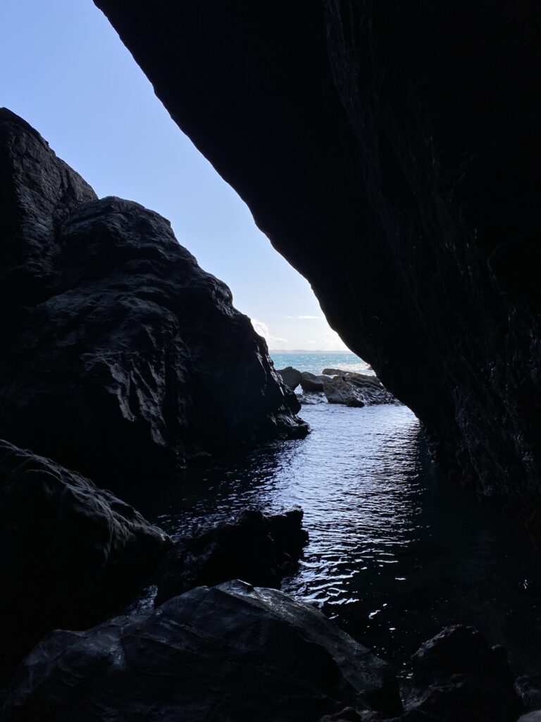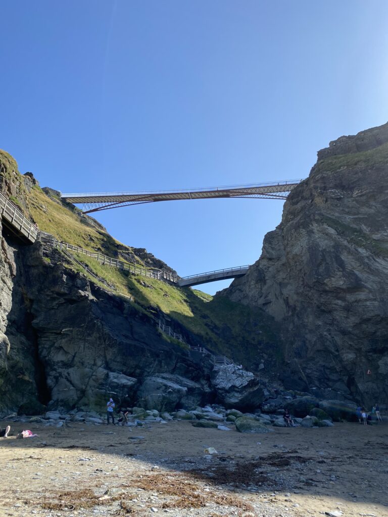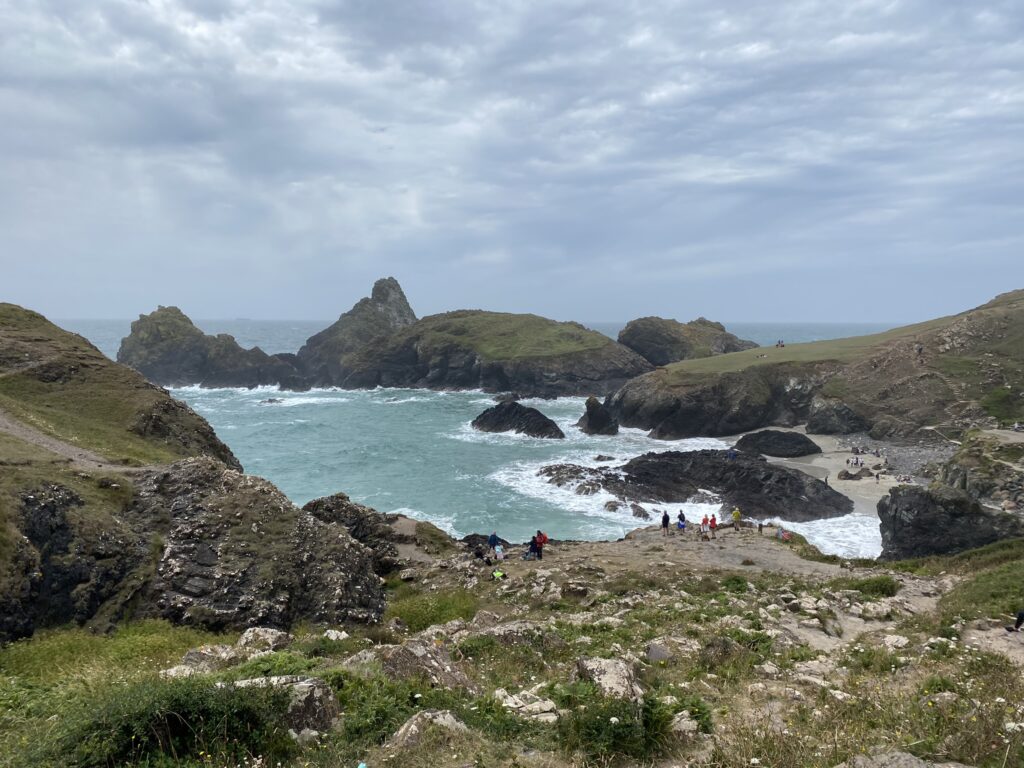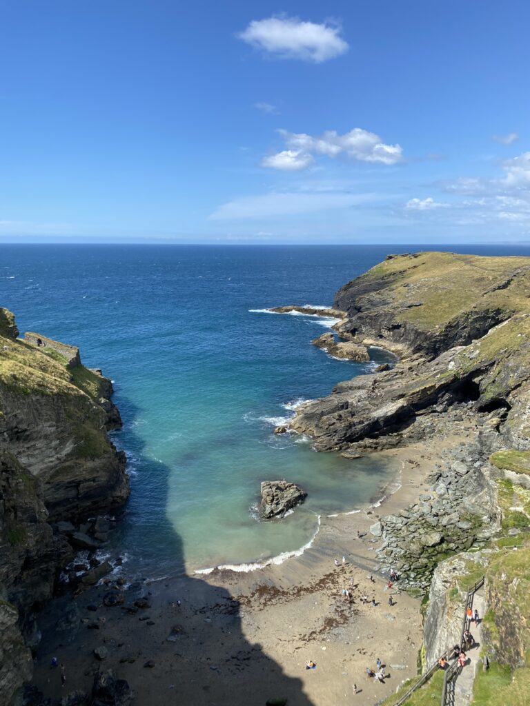 Po procházce kolem zříceniny dříve majestátního hradu jsme sešli dolů na pláž Merlin’s Cave. Ano, název napovídá, že zde měl podle legendy žít kouzelník Merlin, známý z legend o králi Artušovi. Před vstupem na pláž je dobré zkontrolovat si časy přílivů, aby vás voda neodřízla. A malý tip, pokud chcete ušetřit za vstup do areálu hradu, můžete jít pouze na pláž, kde se neplatí. Nicméně výhledy z útesů od hradu určitě stojí za to. Na pláži Merlin’s Cave jsme byli za odlivu, viděli jsme několik koupajících se lidí, rozverných psíků pobíhajících po pláží či jednu velkou medúzu vyplavenou na břeh. Sledujíc tuto scenerii jsme posvačili cornish pasty, typické cornwallské jídlo. Potom jsme prolezli samotnou Merlinovu jeskyni, která šla projít skoro až do moře.