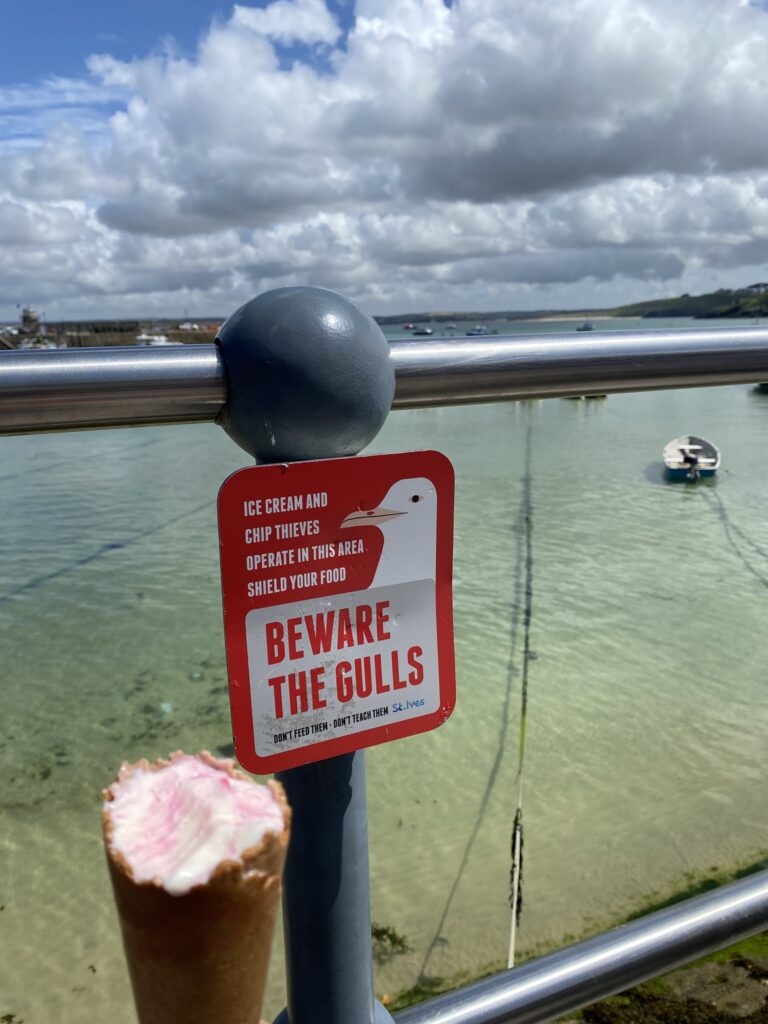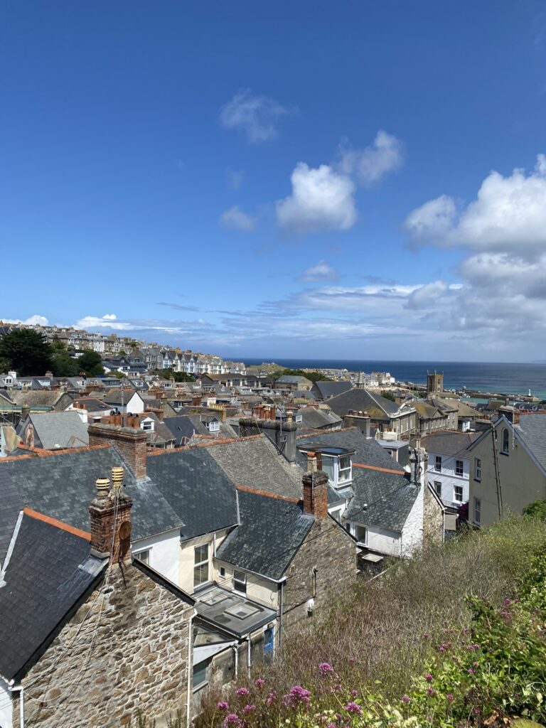 Čekala nás tedy krásná procházka městem podél pláže. Manžel zamířil pro „nejlepší cornish pasty“ a já si dala zmrzlinu. V St Ives určitě nepodceňujte cedule, které upozorňují na racky – viděli jsme v akci, jak vytrhli postarší paní její zmrzlinu. Potom, co jsme viděli, jak jsou pláže St Ives čisté a voda průzračná, samozřejmě jsme dostali chuť si zaplavat. Pláží je tam opravdu dostatek, okolo celého města. My jsme zvolili Porthgwidden Beach, alespoň trošku schovanou mimo centrum. Po osvěžujícím koupání (hned u pláže jsou veřejné toalety, kde se dá převléct) jsme se prošli na vrchol městečka ke kapli St Nicholas, odkud byly krásné výhledy.