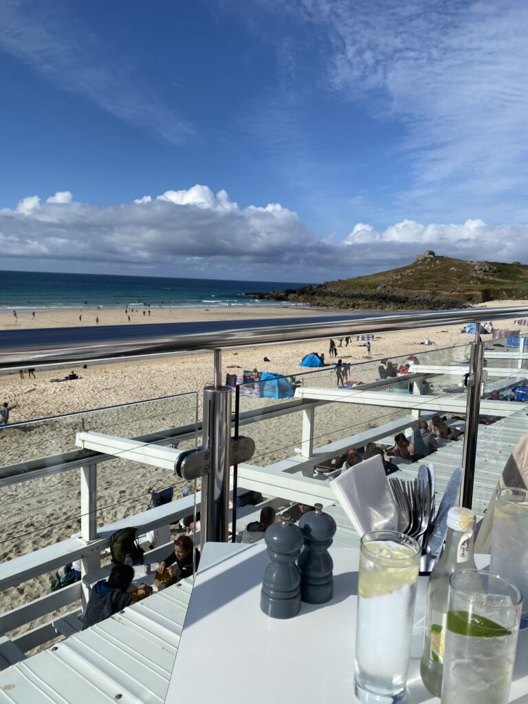Před odjezdem jsme si ještě dali večeři s výhledem na pláž v Porthmeor Beach Café, kde dělají výborné tapas a krevety. Místo jsme našli úplnou náhodou. Hned vedle je také slavná galerie Tate.