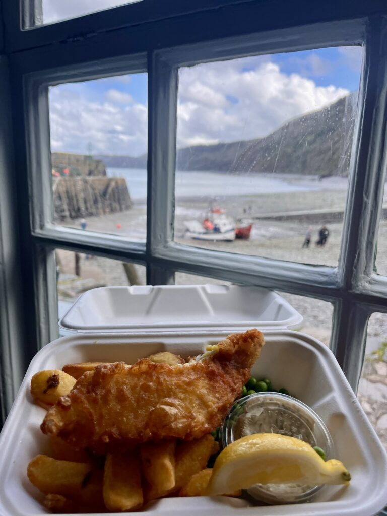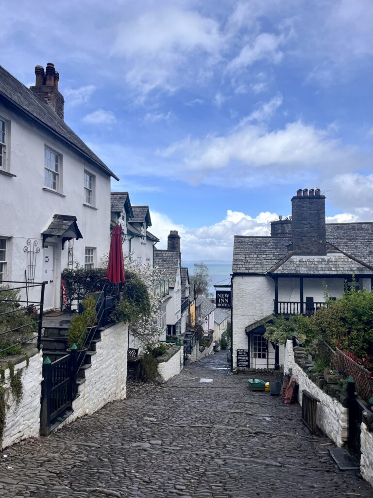 V Clovelly tedy doporučuji sestoupit vesnicí až úplně na pláž, kde se při odlivu dá dojít až k poměrně vysokému vodopádu. Když říkám sestoupit, myslím to doslova, protože Clovelly stojí v kopci a sestup dolů je poměrně prudký, obzvlášť na starém dláždění a obzvlášť po dešti. Proto je důležité nepodcenit obuv (tohle znovu platí pro celou Anglii, pokud nejedete jenom někam do města). Na pláži je typická anglická hospoda z 18. století, kde mají výborné fish & chips ze zdejších nalovených ryb, případně jiné místní speciality. Také jsou tam obchůdky se suvenýry, zmrzlinou, tradičními pasties či scones. Zmrzlina v Cornwallu i Devonu je mimochodem výborná, pokud je místní z jejich smetany a mléka. Jinak pro milovníky anglických historických a dobových filmů nesmím zapomenout zmínit, že v Clovelly se natáčel film The Guernsey Literary and Potato Peel Pie Society, pojednávající o málo známé nacistické okupaci ostrova Guernsey, s romantickou zápletkou. Já jsem film viděla dávno před návštěvou Clovelly a ještě donedávna jsem si myslela, že se opravdu točil na ostrově Guernsey, a pamatuji, jak se mi místní příroda a pláže líbily a říkala jsem si, že bych ostrov měla někdy navštívit. Nato jsem se pak náhodou dozvěděla, že tyto scenérie byly ve skutečnosti v Clovelly a Devonu.