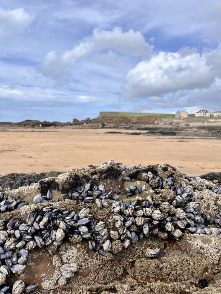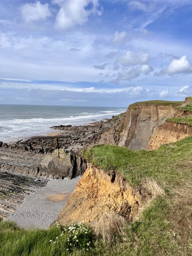 Sandymouth Bay je nádherná oblast a zátoka s krásnými plážemi, útesy a stezkami podél pobřeží. Je součástí Hartland Cornwall Heritage Coast. Hned u pláže a parkoviště je tam kavárna, kde jsme se po příjezdu opět museli schovat před vichrem a kroupy. Po chvíli se mraky odporoučely a my si užili krásnou procházku na útesech.