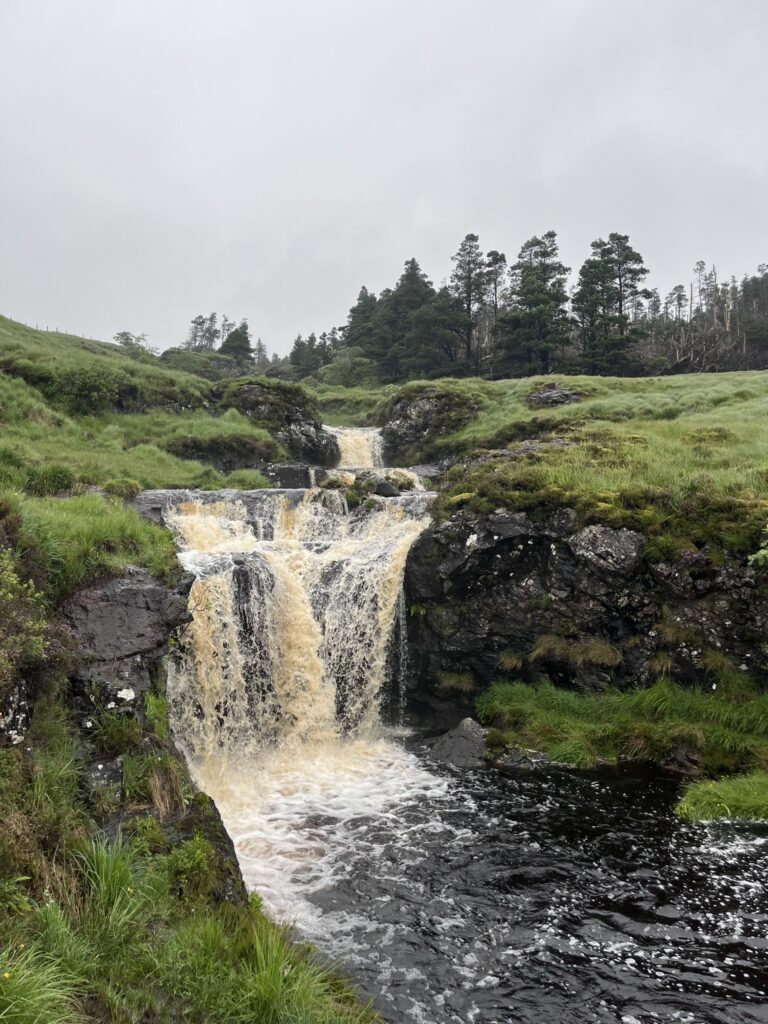 Hlavním bodem dne byla návštěva tzv. Fairy Pools, což je vlastně oblast plná potůčků, vodopádů a malých bazénku, kde se lidé v lepším počasí i koupají. Nás při procházce podél místních vodopádů zastihl snad ten nejsilnější désť, který jsme ve Skotsku zažili, takže jsme po procházce mezi vodopády běželi zpět k autu, protože ani vrstva nepromokavé bundy a dvou pláštěnek nestačila. V autě jsme se osušili (další výhoda auta v deštivém Skotsku) a vyrazili jsme dál směrem do Portree, největšího městečka na ostrově Skye. V Portree jsme se trochu prošli, zavítali jsme do outdoorového obchodu s vybavením na kempování a turistiku (i tu deštivou), a já si koupila ještě jednu goretexovou bundu.
