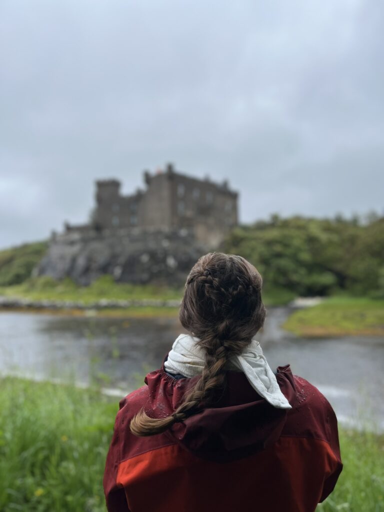 Ráno opět vydatně pršelo, proto jsme se rozhodli vyrazit na snídani do Portree, kde se dá nelézt několik útulných kavárniček. Poté jsme se jeli vzhledem k trvajícímu dešti podívat na zámek Dunvegan, tradiční sídlo skotského klanu MacLeod. Pro fanoušky Cizinky nebo obecně jakobitského povstání tu mají vystavený pramínek vlasů a vestičku Bonnieho Prince Charieho (Charlese Edwarda Stuarta), který vedl poslední neúspěšné povstání jakobitů, které skončilo porážkou Stuartovců a skotských klanů v bitvě u Cullodenu roku 1746 (tam se také podíváme, ale až trochu později).