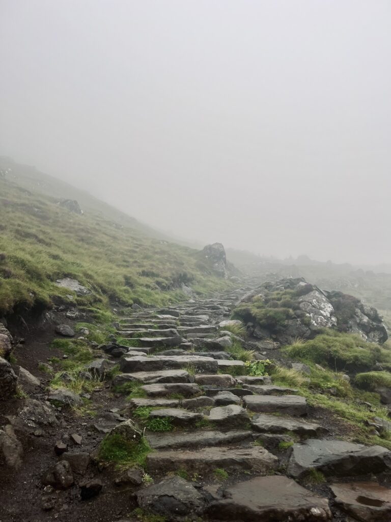 A protože na další den už jsme měli rezervovaný trajekt dál na Hebridy, byl toto jediný možný den, kdy bylo v itineráři místo ještě na výšlap k ikonickému vrcholu Old Man of Storr, což je snad nejslavnější dominanta ostrova Skye. I přes stále vydatný déšť, mlhu a vítr jsme se rozhodli túru zkusit, ačkoli jsem si o výhledech nahoře nedělala moc iluze. Déšť mi nicméně připadal až osvěžující, o čerstvém vzduchu ve Skotsku ani nemluvě. S dobrou výbavou jsme poměrně dlouho vydrželi suší. Výhledy samozřejmě kazila mlha, ale výšlap to byl skvělý a stál za to i v takovém nezmaru. Cestou jsme potkali několik skupinek turistů z různých koutů světa, kteří snad nevědouce o místním zrádném počasí vyrazili nahoru v teniskách a džínách. Poměrně utrápeně se nás ptali, jestli to stojí za to a jak je to ještě daleko nahoru..