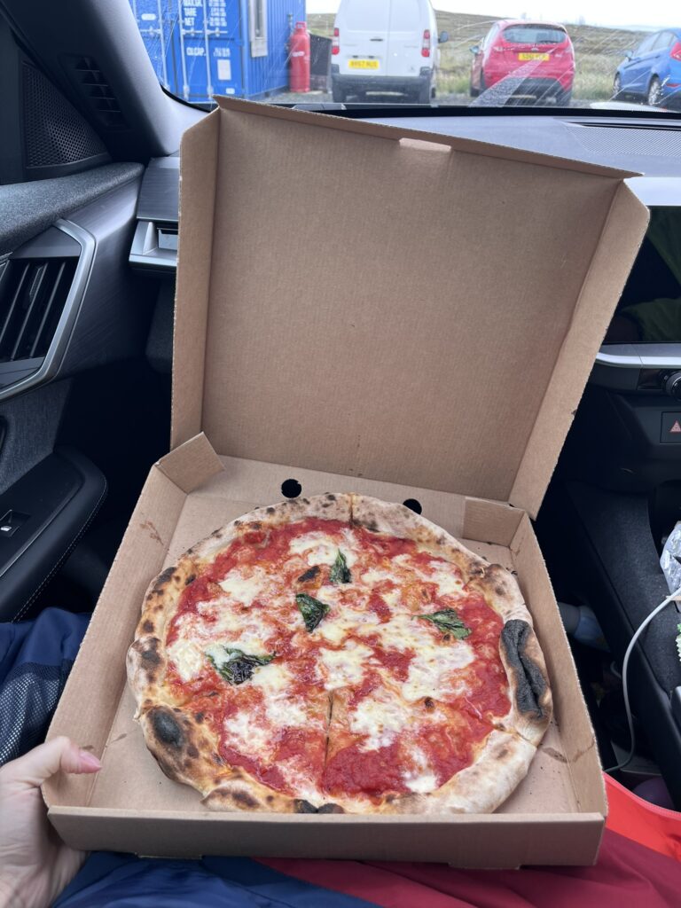Jak jsme pokračovali v cestě, objednali jsme si k vyzvednutí pizzu ze stánku Crust, který měl výborné recenze. Uprostřed ničeho se tu opravdu peče výborná pizza, a to jak klasická, tak místní vylepšená „po Gaelsku“.