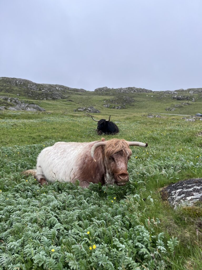Dali jsme si pomalou snídani, uvařili čaj a kochali se. Nebylo kam spěchat, jen na další a další úchvatné pláže. Jednou z nich byla pláž Luskentyre, u které se pásly skotské kravky, neboli Highland Cows – plemeno, které si zamiluje snad každý návštěvník Skotska.