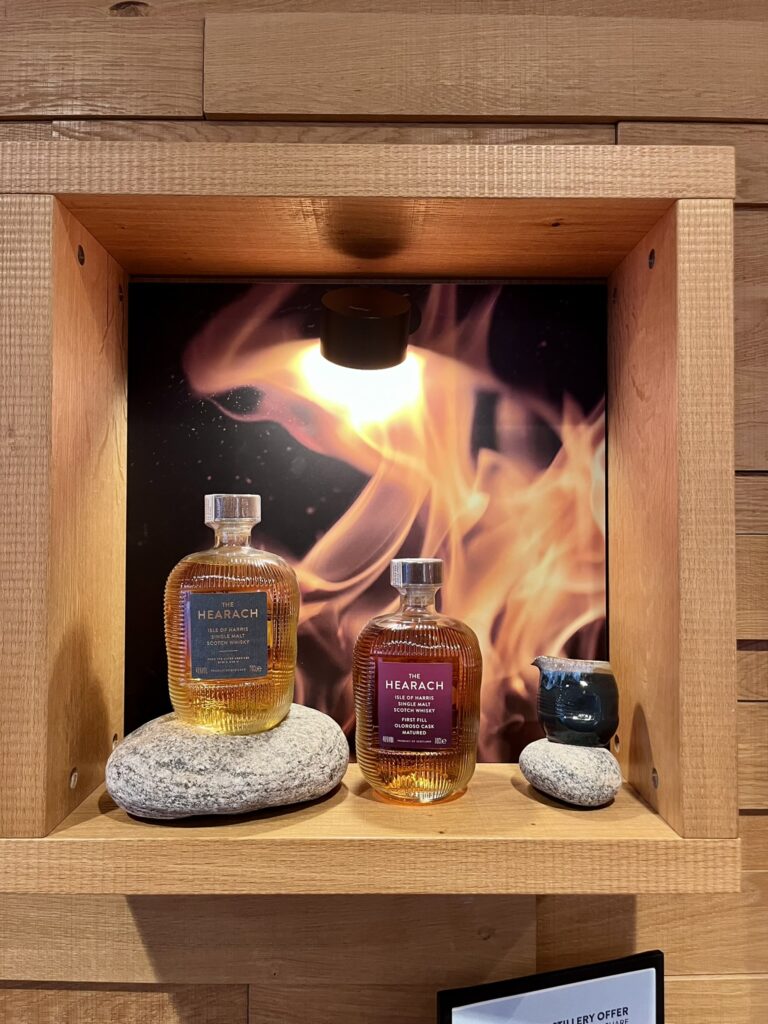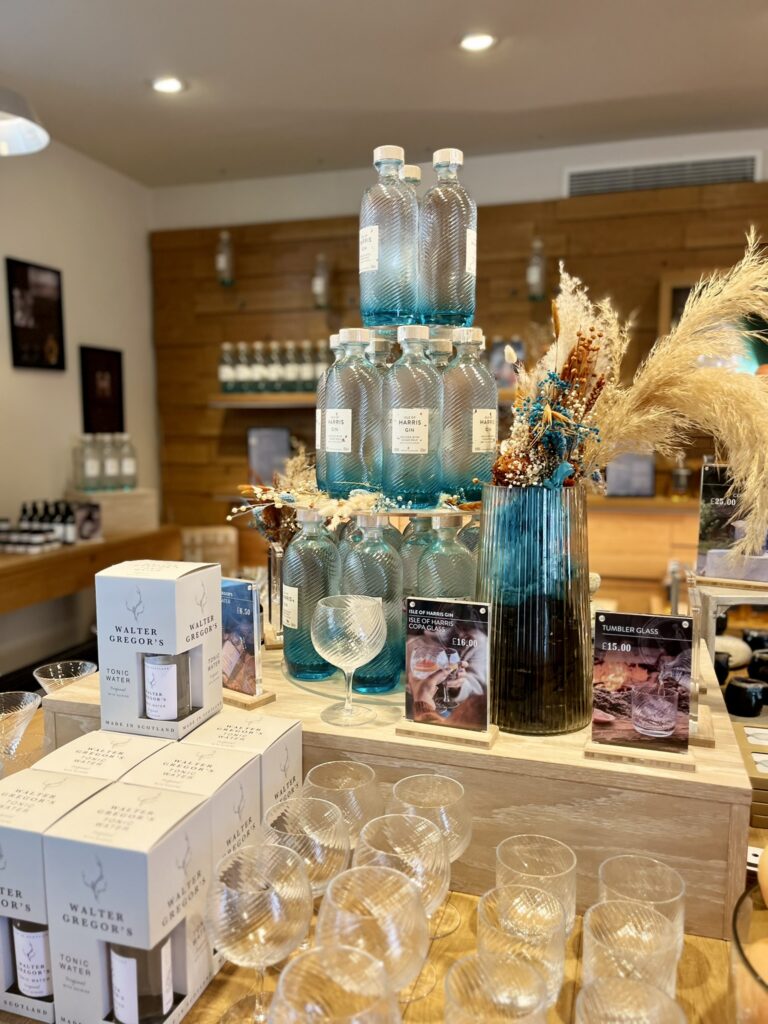 Při čekání na nalodění v Tarbertu jsme ještě zaskočili destilerie Isle of Harris, abychom domů přivezli pořádnou whiskey. Kromě místní značky Hearach tu samozřejmě dělají i slavný Harris Gin.