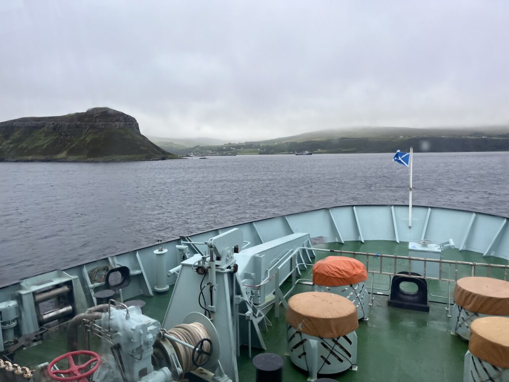 Ráno jsme sbalili stan, naložili auto a jeli jsme se nalodit na trajekt na Hebridy, na ostrov Harris (trasa Uig – Tarbert). Nikdy jsem na tak velké lodi nebyla a tak to pro mě byl poměrně velký zážitek. Po zaparkování auta na spodní palubě jsme jen s pár věcmi vyrazili na palubu pro cestující, kde byla jak velká jídelna, tak pozorovací paluba, spousta míst k sezení a odpočinku, zóna pro děti a také pro cestující s pejsky. Dali jsme si výbornou snídani a sledovali moře okolo nás, dokud se nezačaly objevovat obrysy Vnějších Hebrid, kam jsme připluli za asi dvě hodiny.
